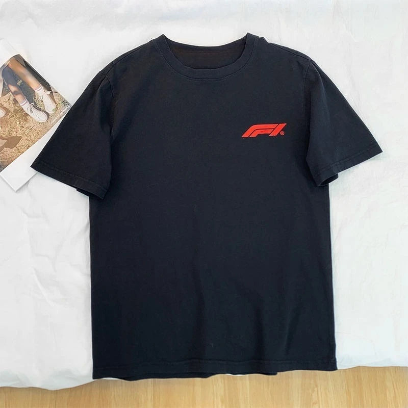 Design: Features a vibrant F1 racing print with a classic half-sleeve cut and oversized fit.